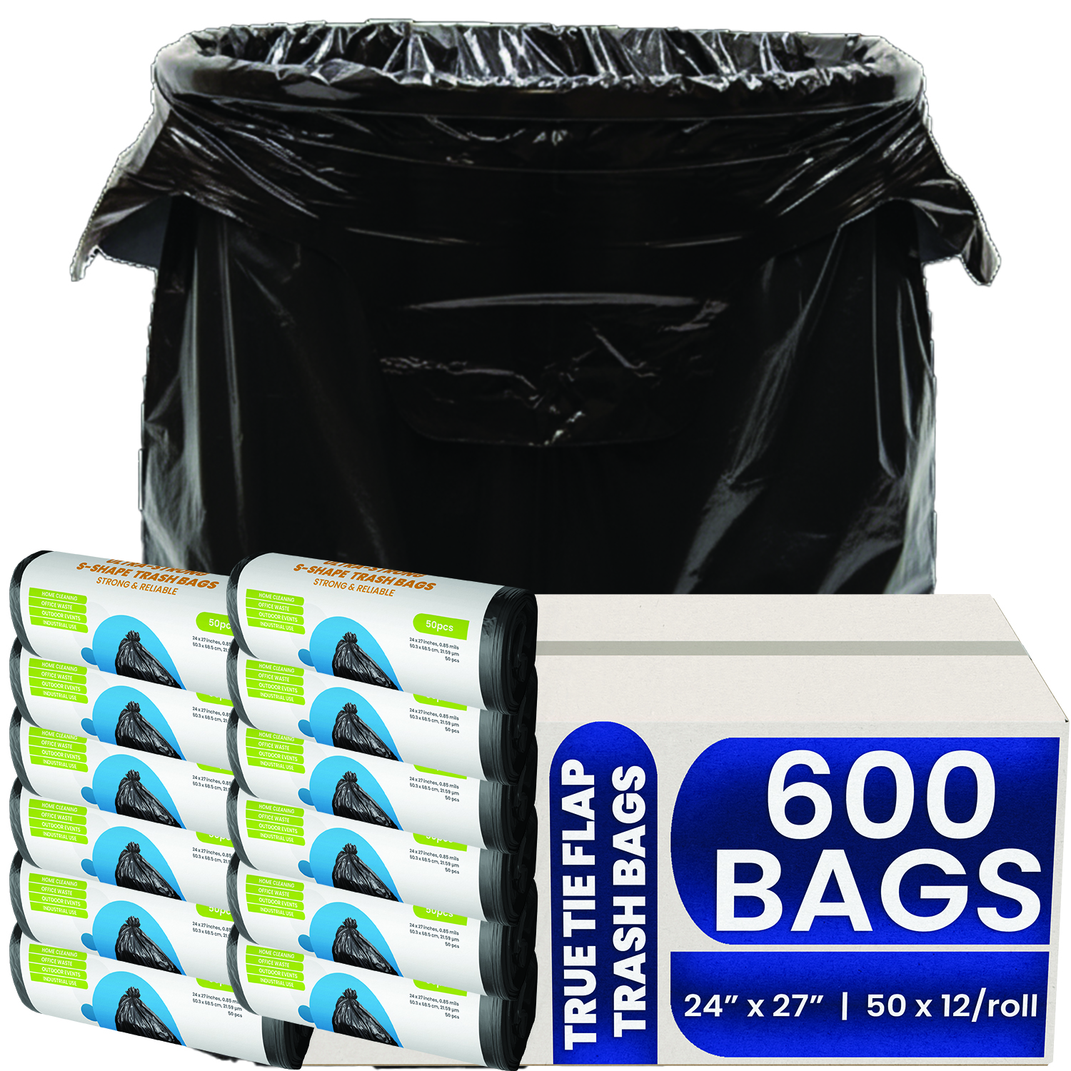 Melplas S-Shape Trash Bags – 24×27 inches, 0.85 mil Thick, 600 Count